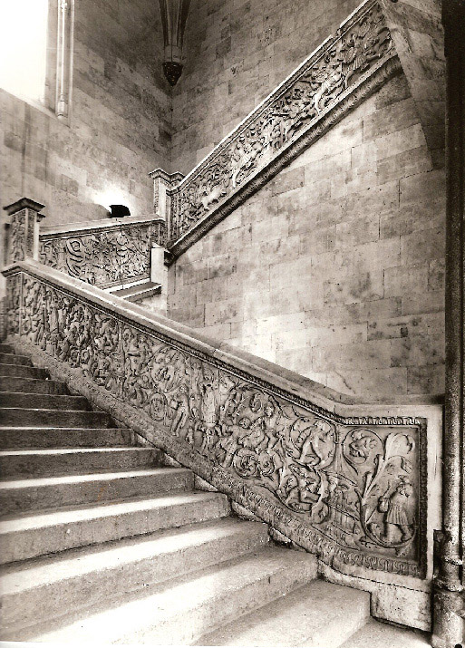 La escalera fue construida para conducir a una sala nueva, edificada a partir de 1512, destinada a una nueva biblioteca, y que ocuparía toda el ala del poniente del edificio. Su decoración se presenta en tres tramos enmarcados por cuatro pilastras. Es evidente que no se empieza la construcción de una escalera por la decoración de su antepecho, luego esta es posterior. Ofrece en tres etapas una ascensión purificadora, donde se expresa el ideal caballeresco de perfeccionamiento moral cristiano, el de los caballeros del Toisón de Oro, cuyo signo aparece en una pilastra. El Toisón, como exigencia de superación de si mismo inculcada desde la más tierna infancia, marcará Carlos V para siempre. La presencia del Toisón borgoñón (en el tercer tramo) es un dato apreciable. En efecto, el emblema de nuestra cartela, tan igual de forma a la vidriera de Dijon, no deja dudas sobre su significado y afirma la presencia de Carlos en el programa de la escalera, lo cual condiciona a la vez el mensaje, que no es sólo moral sino político y religioso, y la fecha de las tallas, que hay que postergar hasta su advenimiento.